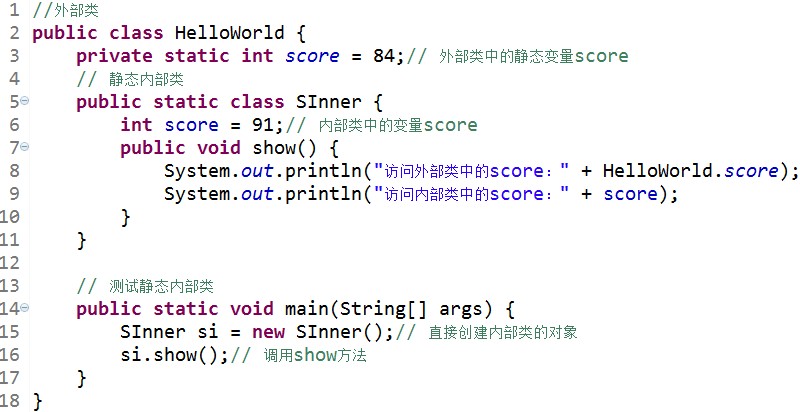 2、 如果外部类的静态成员与内部类的成员名称相同,可通过“类名.静态成员”访问外部类的静态成员;如果外部类的静态成员与内部类的成员名称不相同,则可通过“成员名”直接调用外部类的静态成员