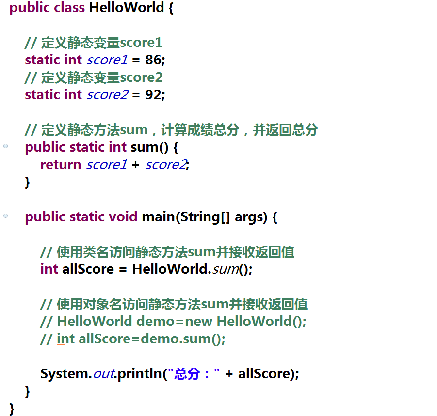 在编辑器中分别定义了两个静态变量 score1 和 score2 ,用于保存成绩信息。定义了一个静态方法 sum ,用于计算成绩总分,在 main 方法中通过调用静态方法输出成绩总分